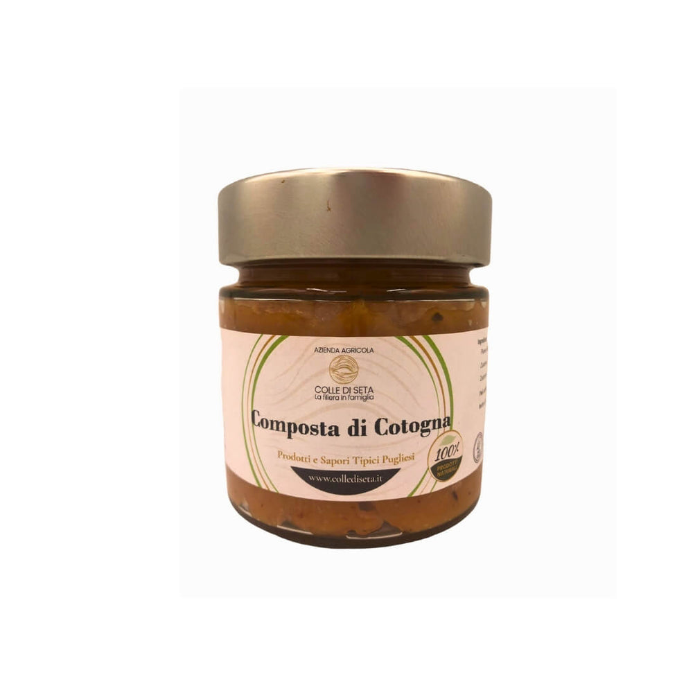 La composta di mela cotogna è ottenuta a partire dalle mele cotogne coltivate nei nostri campi. Un frutto che sta pian piano scomparendo dai nostri campi e dalle nostre tavole. Caratteristico per la sua consistenza e la nota acida al gusto, la mela cotogna viene generalmente servita sbollentata e aggiunta di zucchero e limone.