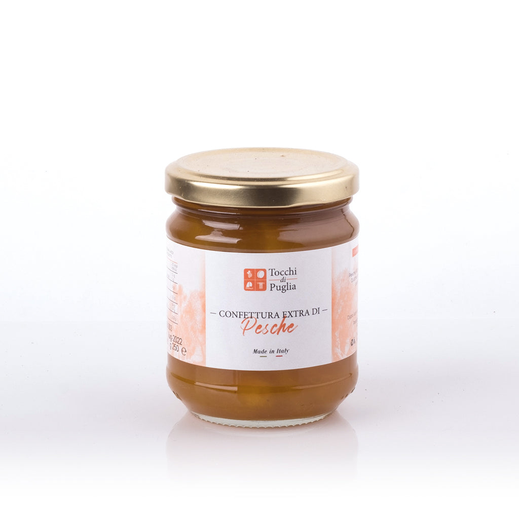 Le pesche che utilizziamo sono a pasta gialla della varietà “Maycrest”. Poco fibrose, trasmettono morbidezza alla confettura. La raccolta avviene a fine giugno con 15-17 gradi Brix. Per la lavorazione si sceglie in modo accurato e minuzioso la frutta migliore in modo tale da rendere il prodotto genuino. La lavorazione avviene secondo i dettami dell’antica tradizione Pugliese che ne consente di mantenerne le caratteristiche organolettiche. Si presta per deliziose colazioni, merende e per molteplici applicazioni in pasticceria