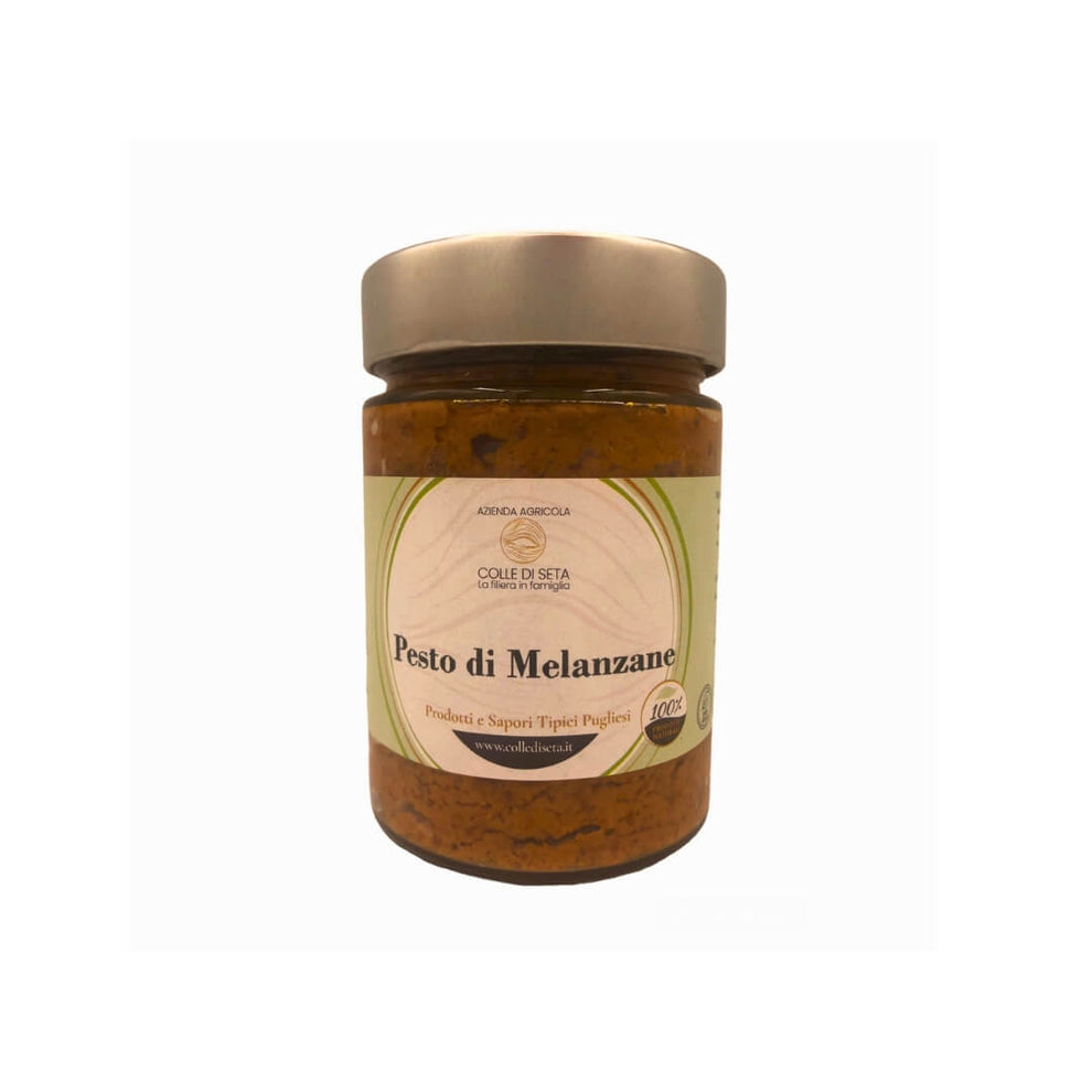 Il pesto di melanzane si ottiene dalla fine omogeneizzazione delle nostre melanzane con i nostri pomodorini una miscela di frutta secca e il nostro Olio Extravergine di Oliva.